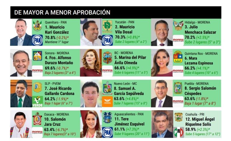 En el ranking de aprobación de los Ejecutivos Locales, el numero 1 es Mauricio Kuri González (PAN), de Querétaro con un 70.8%; el segundo lugar está Mauricio Vila Dosal (PAN) de Yucatán con 70.3%, quien subió dos lugares en relación a la encuesta anterior; el tercer sitio es para Julio Menchaca Salazar (Morena) de Hidalgo con el 70.2%; cuarto sitio para Alfonso Durazo Montaño (Morena) de Sonora con 69.6%; en la posición cinco está Marina del Pilar Ávila Olmeda (Morena) de Baja California con 66.6%; en el lugar seis está Mara Lezama Espinosa (Morena) de Quintana Roo con 66.2%, destaca que subió cuatro lugares, es decir del décimo al sexto.