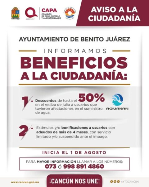 Cancún, Q. R., a 17 de julio de 2023.- A exigencia de la Presidenta Municipal Ana Paty Peralta y del Ayuntamiento de Benito Juárez, la empresa concesionaria de agua potable Aguakan se comprometió a implementar un nuevo programa “Compromiso compartido”, a partir del 1 de agosto próximo, que incluye descuentos de hasta el 50% a usuarios que tuvieron afectaciones en la dotación del suministro de agua, así como facilidades para brindar estímulos y/o bonificaciones a usuarios con adeudos de más de 4 meses, con servicio limitado y/o suspendido ante el impago.