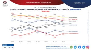 En cuanto a la pregunta, “¿Quién le gustaría que fuera candidato a senador?”, la encuesta, al medir a los aspirantes de Morena, pone en primer lugar, con un 17.3 por ciento, a la hoy diputada federal, Anahí González Hernández, quien busca también la presidencia municipal de Benito Juárez.
