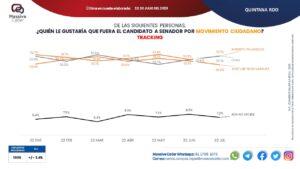 Asimismo, al medir la intención de voto a favor de algún aspirante de Movimiento Ciudadano, la encuestadora señala que Roberto Palazuelos está a la cabeza con un 32.1 por ciento, seguido de José Luis Pech, con el 28.6. Por su parte, la opción «Otro» tiene el 32.1 por ciento y «No decide» el 7.2.