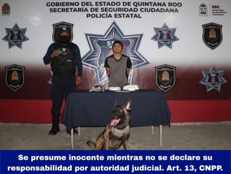 Cancún.- Gracias a la binomio canina “Tina”, elementos de la Secretaría de Seguridad Ciudadana (SSC) lograron la detención de un masculino identificado como Manuel “N” en posesión de sustancias ilícitas.