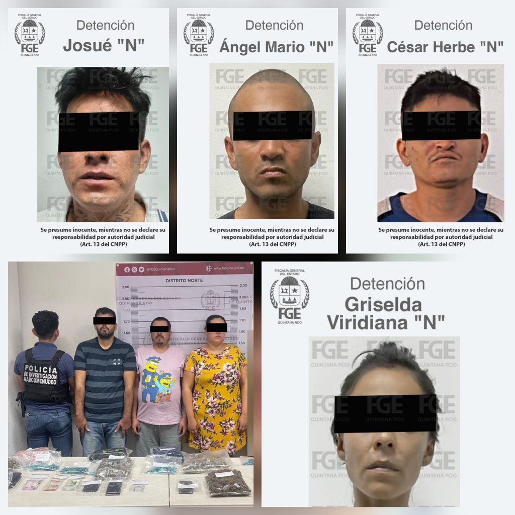 En una primera acción, los agentes participantes detuvieron a cuatro personas por delitos contra la salud, tres adultos y una adolescente, en calles del fraccionamiento Jardines del Sur, donde, tras una inspección de rigor, fueron sorprendidos en posesión de sustancias posiblemente ilícitas.