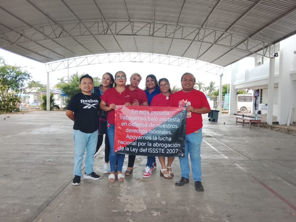 Los maestros de las escuelas de educación preescolar, primarias y secundarias apoyaron el movimiento nacional con banderines de protesta y mantas que a la letra se lee: “En esta escuela trabajamos bajo protesta en defensa de nuestros derechos laborales. Apoyamos la lucha nacional por la abrogación de la Ley del ISSSTE 2007”.