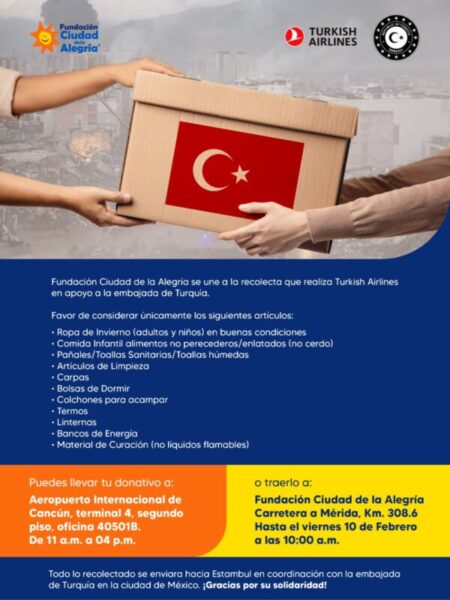 Lo anterior a pesar que un día antes la Cruz Roja anunciara que no abriría centros de acopio en la entidad; no obstante, los graves daños causados al pueblo turco por los sismos, obligaron a responder con ayuda humanitaria, misma que se entregará a la Embajada de Turquía en México y a través de Turkish Airlines desde el aeropuerto de Cancún hacia el país afectado.