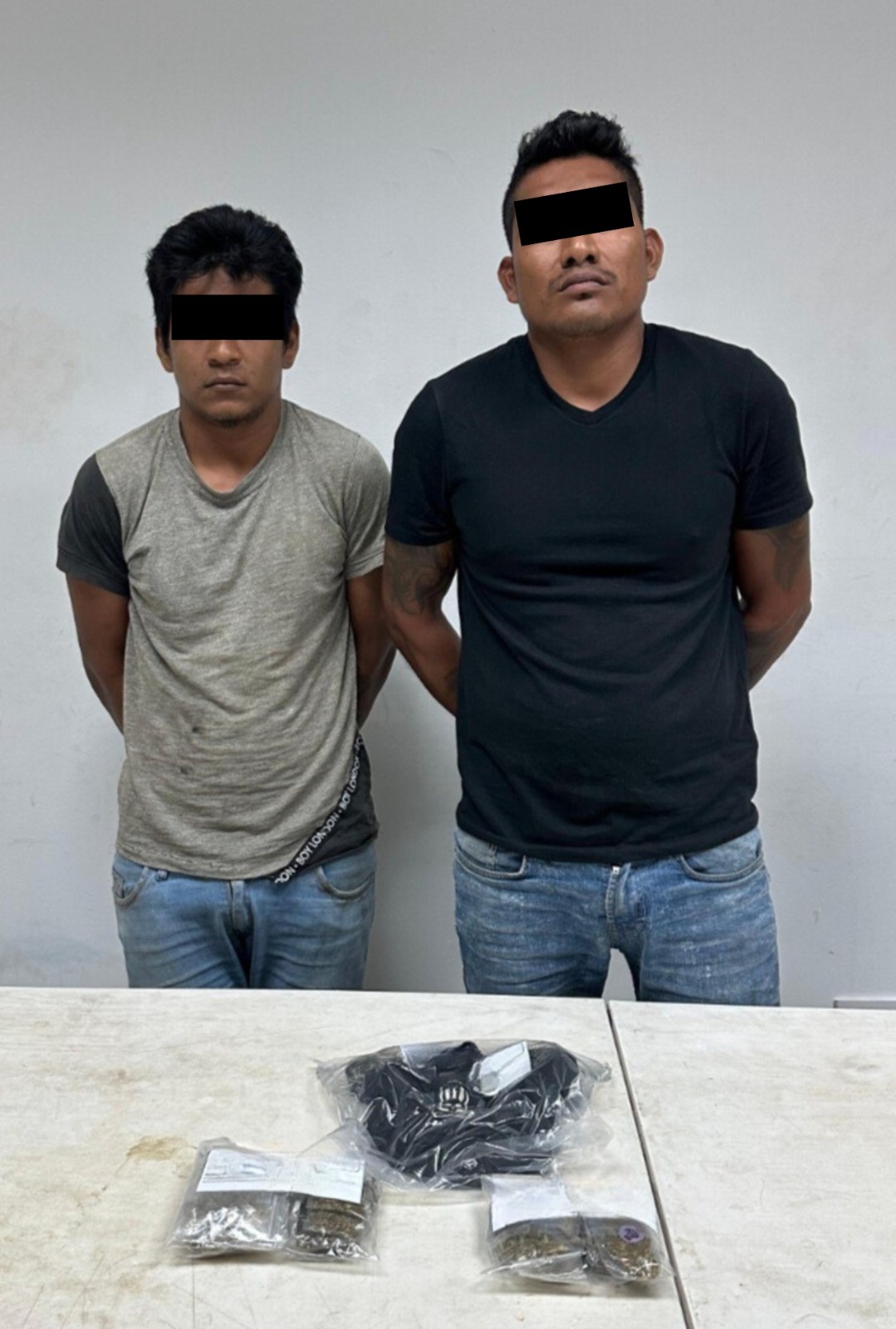 La detención de Omar “N”, Jordi Nicolás “N” y un adolescente, tuvo lugar en la avenida Francisco I. Madero, a la altura del fraccionamiento Villas Otoch Paraíso, donde los agentes observaron que entre ellos intercambiaban bolsas que escondieron rápidamente.