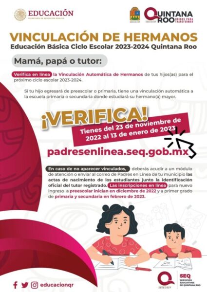 Chetumal.- La Secretaría de Educación de Quintana Roo (SEQ), informa a los padres, madres y tutores de familia, que hasta el 13 de enero del presente año, podrán consultar la verificación en línea sobre la Vinculación Automática de Hermanos de sus hijas o hijos, proceso que inició el pasado 23 de noviembre de 2022 y que corresponde al ciclo escolar 2023-2024.
