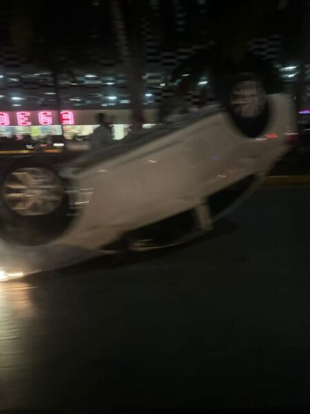 Cancún.- Una aparatosa volcadura se registró la noche de este jueves, luego que un conductor perdiera el control de su vehículo compacto sobre la avenida Bonampak, sin que resultaran lesionados él y su acompañante.