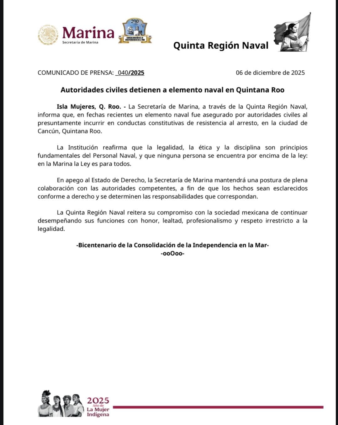 De acuerdo con datos oficiales, el detenido es Matías “N”, Primer Maestre y jefe del C2 de Puerto Morelos.