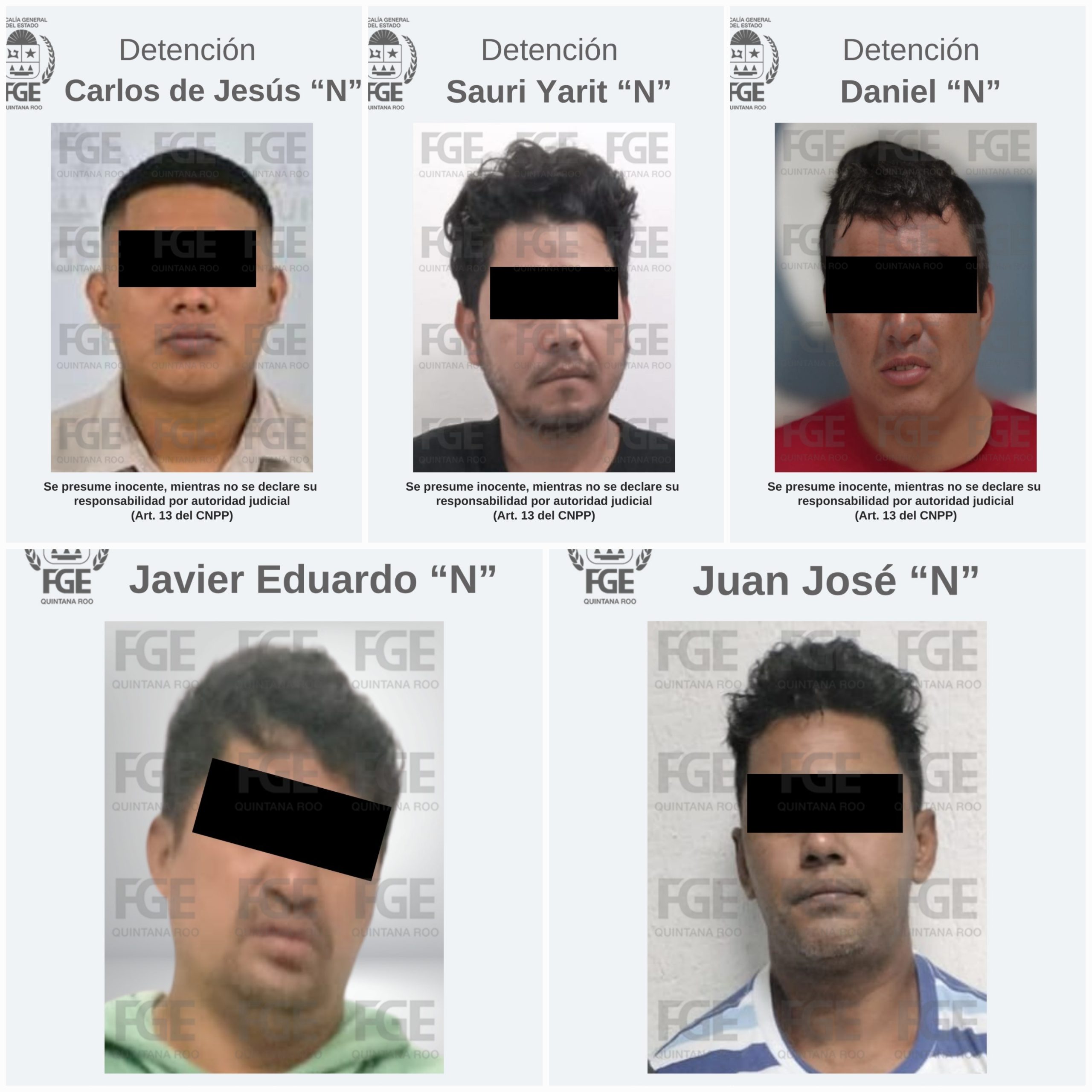 • Los detenidos por elementos de la Policía de Investigación son: Carlos de Jesús “N”, Juan José “N”, Javier Eduardo “N”, Daniel “N” y Sauri Yarit “N”