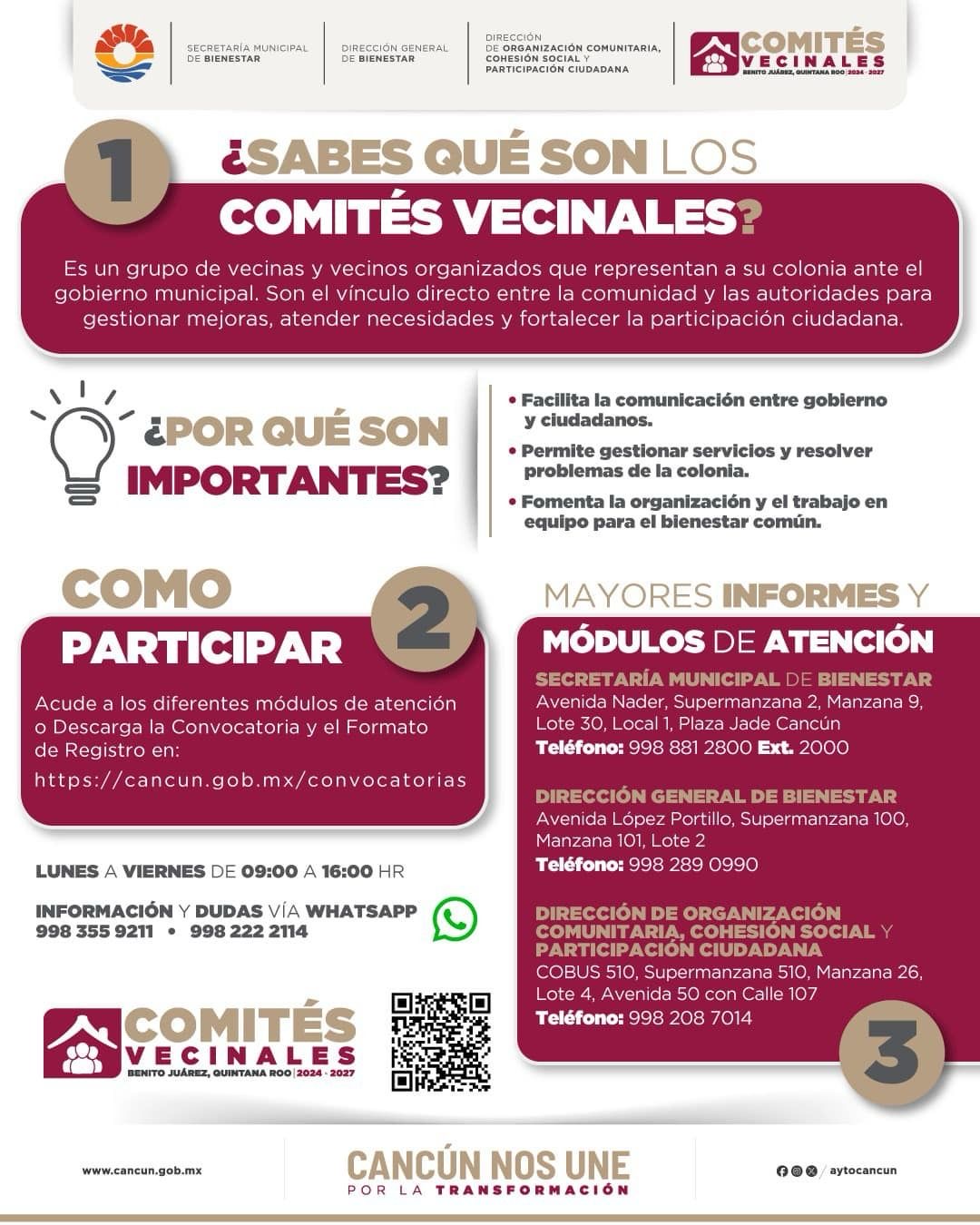 Cancún, Q. R., a 27 de febrero de 2025.- Autoridades del Ayuntamiento de Benito Juárez, mediante la Secretaría Municipal de Bienestar, invitan a las y los ciudadanos a participar en la convocatoria para la elección de los Comités Vecinales para el periodo 2024-2027, cuyo registro se encuentra vigente hasta el 21 de marzo.