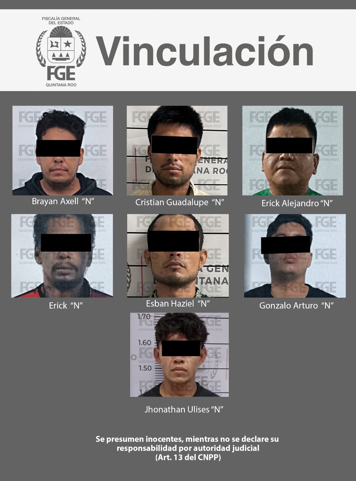 • La Fiscalía General del Estado informa que los imputados son Cristian Guadalupe “N”, Esban Haziel “N”, Brayan Axell “N”, Gonzalo Arturo “N”, Erick “N”, Jhonathan Ulises “N” y Erick Alejandro “N”