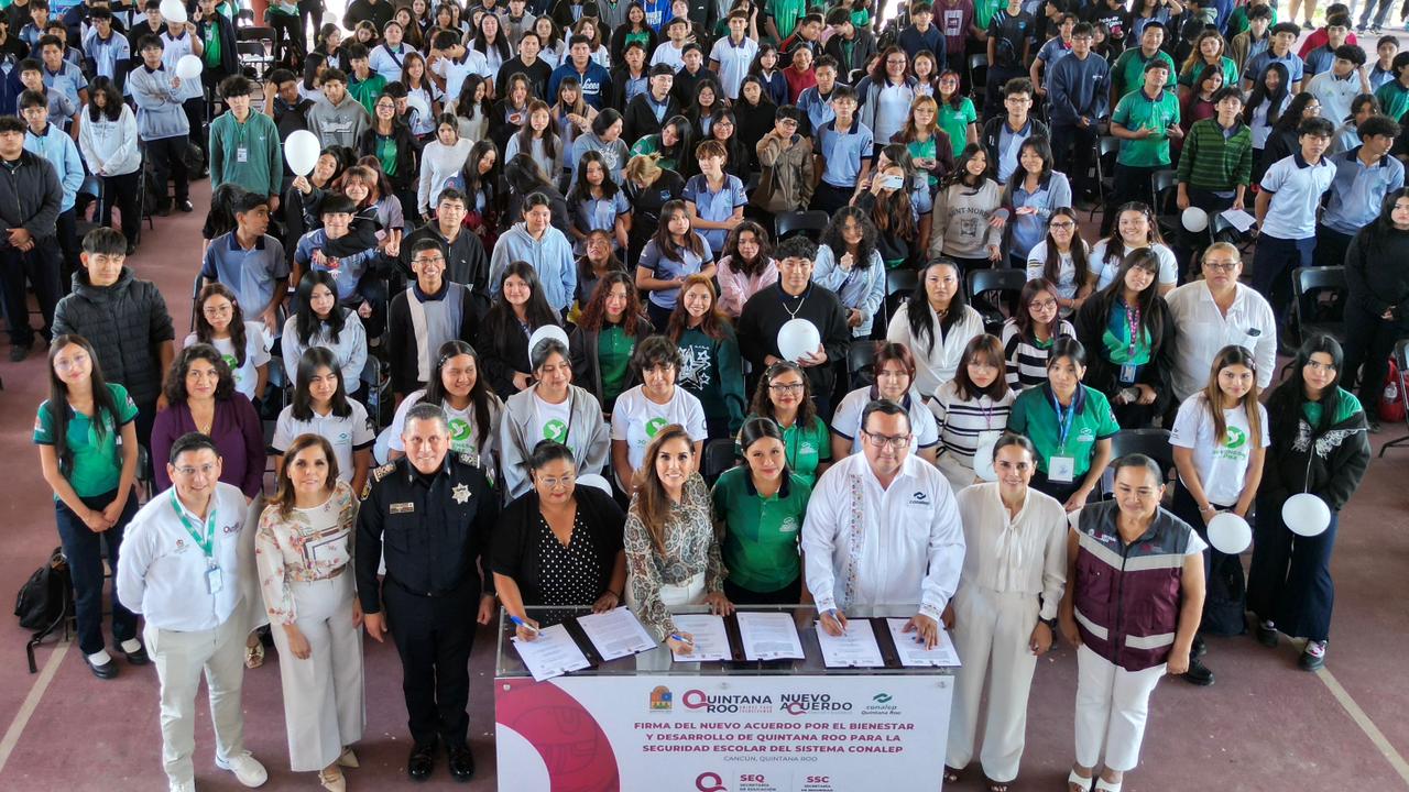 Cancún.- La gobernadora Mara Lezama Espinosa encabezó la firma del Nuevo Acuerdo del Bienestar para fortalecer la seguridad escolar en el sistema CONALEP, en un acto que calificó como histórico al garantizar el derecho de las y los estudiantes a formarse en entornos seguros y en paz.