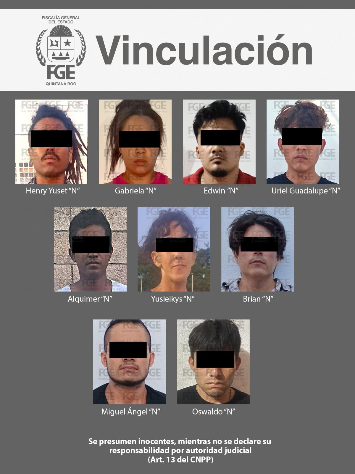• La Fiscalía General del Estado informa que los imputados son Henry Yuset “N”, Yusleikys “N”, Oswaldo “N”, Edwin “N”, Gabriela “N”, Brian “N”, Miguel Ángel “N”, Alquimer “N” y Uriel Guadalupe “N”
