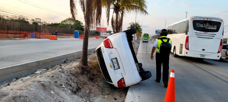 Cancún.- Una aparatosa volcadura, que fue provocada por el corte de circulación que le realizó un vehículo a otro, se registró esta mañana en el bulevar Luis Donaldo Colosio de Cancún, sin que dejara como saldo personas lesionadas.