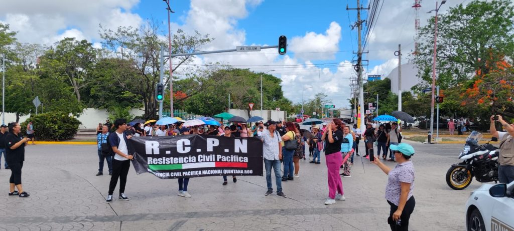 Cancún.- Integrantes del movimiento Resistencia Civil Pacífica Nacional (RCPN) Quintana Roo se manifestaron esta mañana frente al Palacio Municipal y posteriormente bloquearon la glorieta “El Ceviche”, en protesta por los requisitos excesivos para el cobro del predial.