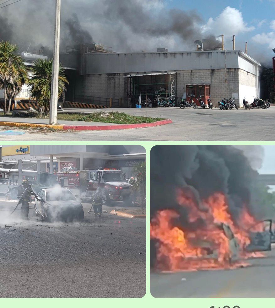 Arden dos autos en el estacionamiento de una plaza en Playa del Carmen