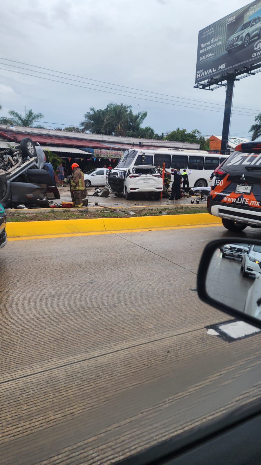 Cancún.- Un aparatoso accidente vial se registró esta mañana sobre el bulevar Luis Donaldo Colosio a la altura del motel Cerezas, donde se reportaron cuatro lesionados y al menos dos personas sin vida.