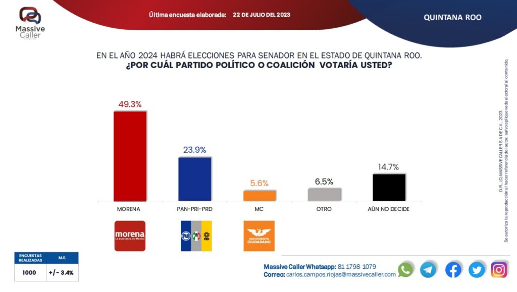 Cancún.- Esta mañana, a través de redes sociales, la empresa encuestadora “Massive Caller” dio a conocer su medición de la intención de voto para senadores de Quintana Roo, en la cual Morena mantiene su ventaja en esta materia, al contar con un 47.8 por ciento, seguido del 25.7 por ciento de la coalición PAN-PRI-PRD.