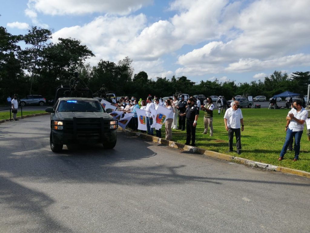 Autoridades congregadas en la Glorieta Fonatur, en el kilómetro 25 del bulevar Kukulcán, presenciaron el despliegue de efectivos de la Policía Municipal, Estatal, Guardia Nacional, Ejército Mexicano, Marina, Protección Civil, Tránsito, Instituto Nacional de Migración, Bomberos y la Fiscalía General de la República.