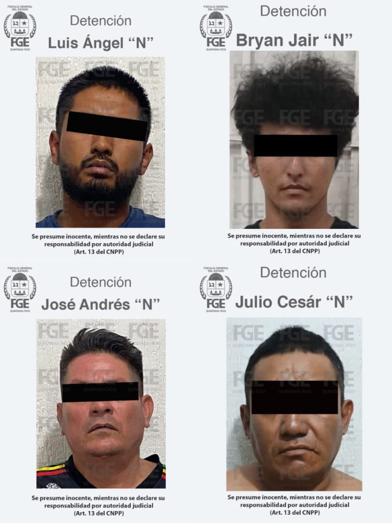 Cancún.- La Fiscalía General del Estado informó esta tarde la captura de cuatro sujetos, de los cuales dos están involucrados en el asesinato de un niño ocurrió hace una semana en la Zona Hotelera de Cancún. Además, este par están implicados en el asesinato de dos personas dentro de un autobús en el bulevar Kukulcán.